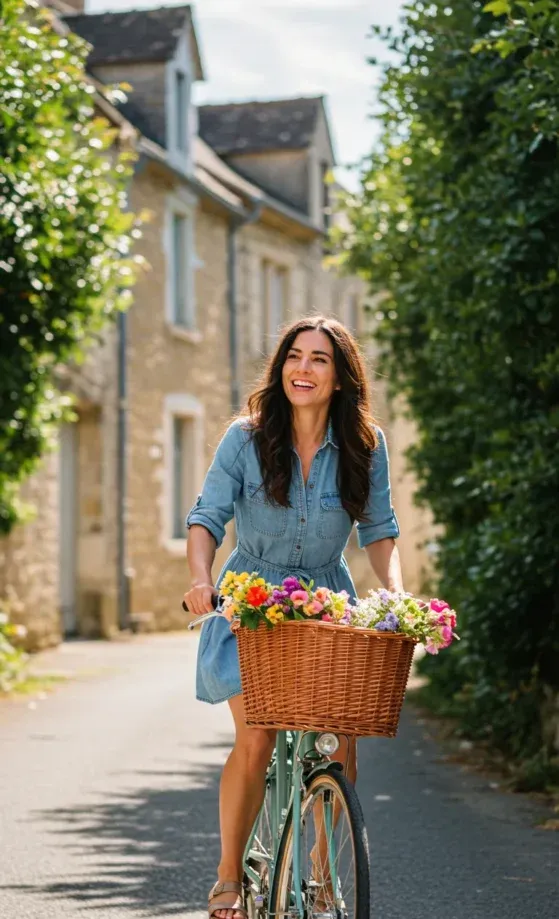 This outfit is the perfect mix of casual and stylish for a relaxed summer day. The model wears a light denim shirt dress that falls just above the knee, cinched at the waist with a simple belt to create a flattering silhouette. She pairs the dress with comfy sandals, and the basket of colorful flowers in her bike s front basket adds a cheerful touch to the look. The natural background of tree-lined streets and quaint houses enhances the fresh, carefree vibe.