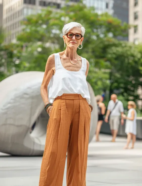 Here we ve got a clean white tank top with a soft, relaxed shape, tucked into high-waisted rust-colored wide-leg pants. Chunky accessories and sandals round out the outfit, keeping the whole look effortlessly cool.