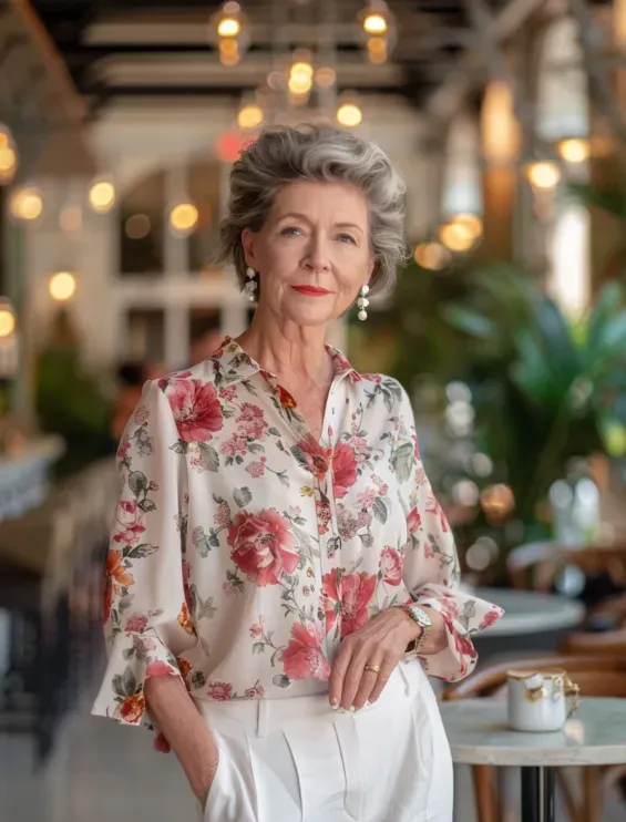This outfit pairs a lightweight floral blouse with flowy bell sleeves and a button-down design with tailored high-waisted white trousers. The rose print brings a romantic touch, while the trousers add polish and structure to balance the look.
