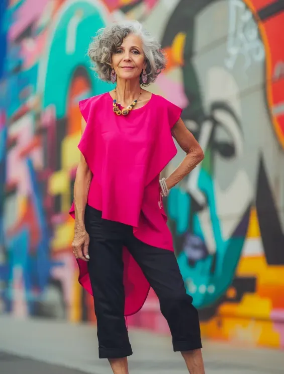 This bold look features a hot pink asymmetrical top that flows longer in the back, paired with cropped black pants and casual sneakers. A chunky statement necklace adds just the right touch of playful glam.