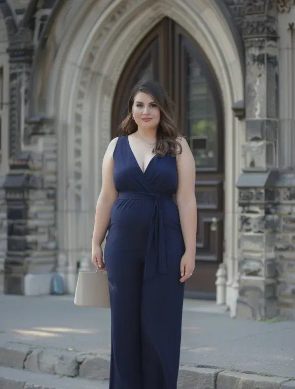 This navy blue jumpsuit is the epitome of chic elegance. The deep V-neck and wrap front create a flattering shape, while the tie belt cinches at the waist, accentuating your curves. The wide-leg style gives it an effortlessly sophisticated vibe, making it perfect for both day and evening occasions. Paired with a simple beige handbag and strappy sandals, this jumpsuit exudes timeless class while keeping things comfortable and stylish.