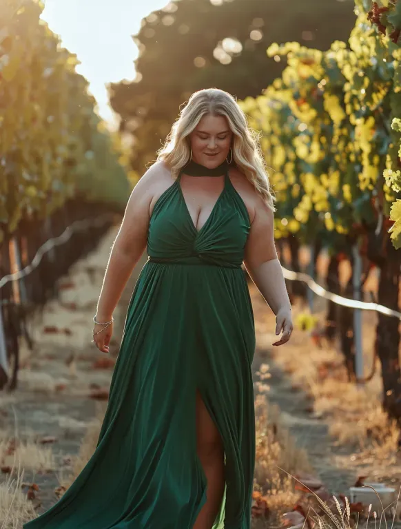 This elegant deep green dress exudes sophistication and charm. The dress features a sultry halter neckline with a twist at the bust, adding structure while maintaining a flowy, relaxed fit throughout the rest of the dress. A daring slit on the side shows just enough leg, perfect for those warm evenings when you want to look polished but feel comfortable. It s the ideal gown for an outdoor gathering, a vineyard stroll, or even a sunset dinner by the beach. The fabric drapes beautifully, creating a flattering silhouette that highlights curves in all the right ways.