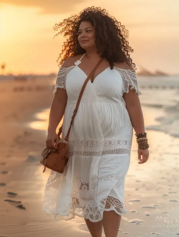 This stunning white bohemian-style dress is perfect for a breezy beach day or a sunset stroll. With its delicate lace detailing and flowing skirt, it brings an effortlessly relaxed yet elegant vibe. The v-neckline and three-quarter sleeves give it a flattering, feminine shape, while the addition of a brown leather belt adds definition to the waist. Paired with layered jewelry and a simple handbag, this outfit feels light, airy, and completely chic.