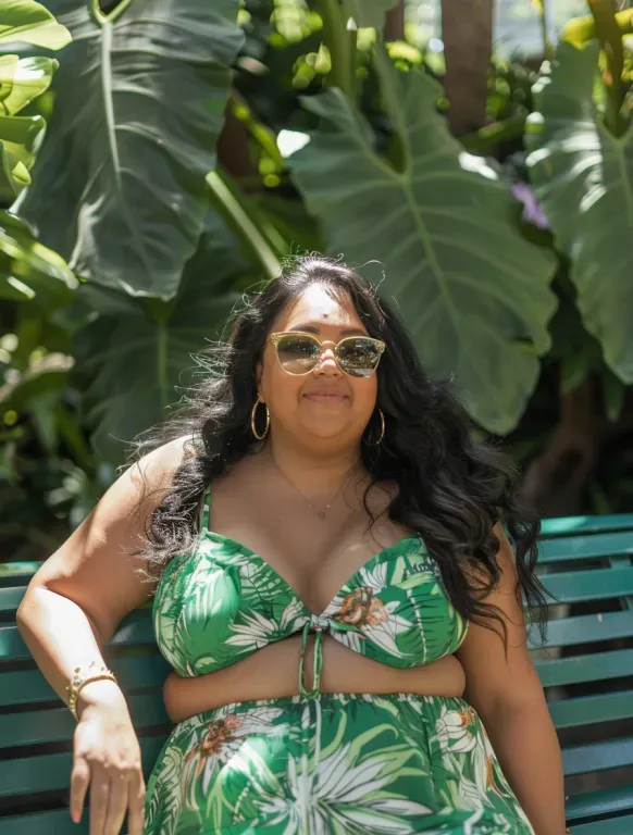 This vibrant green bikini set with tropical palm leaves is made for sun-soaked days! The halter top with a cute tie detail adds a bit of flirtiness, while the matching high-waisted skirt gives a flattering, laid-back vibe. The relaxed, feminine cut enhances the figure in all the right places while providing comfort for a day by the pool or lounging on the beach. A pair of gold hoop earrings and oversized sunglasses complete the look, making it both chic and effortlessly cool.