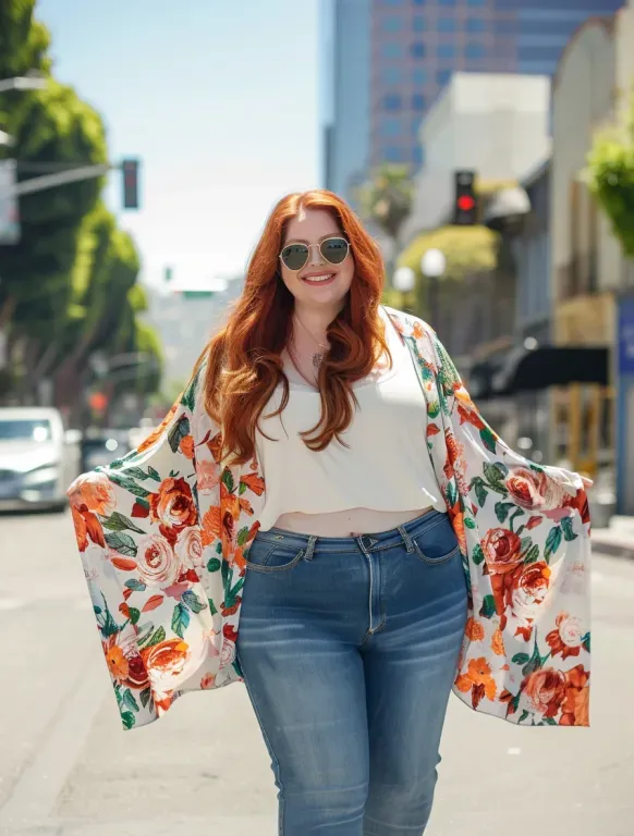 This outfit brings a sense of effortless chic to any casual summer day. A simple white top is paired with high-waisted jeans for comfort and style, while the floral kimono adds a fun, boho-inspired flair. The kimono, with its vibrant florals in shades of orange and green, perfectly complements the relaxed vibe of the look. Paired with neutral sandals and oversized sunglasses, this outfit strikes the ideal balance between laid-back and fashionable.