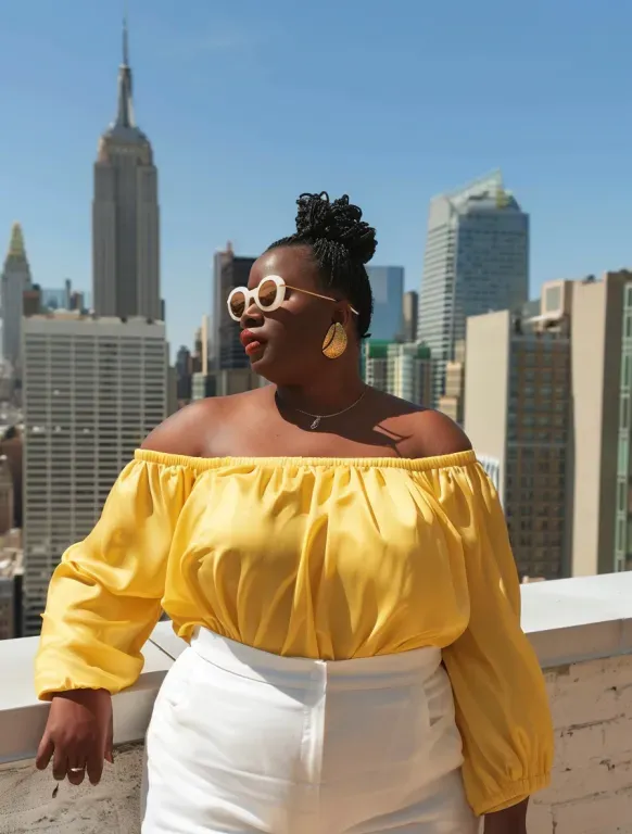 This outfit screams sunny vibes and city chic! The off-shoulder yellow top brings a playful yet sophisticated touch with its billowy sleeves and relaxed fit. Paired with high-waisted white pants, the look feels fresh, breathable, and perfect for any warm-weather outing. Add a stylish straw hat and oversized sunglasses, and you ve got yourself a look that exudes confidence and class. The simple white pants create a sleek contrast to the bold yellow, making the top really pop.