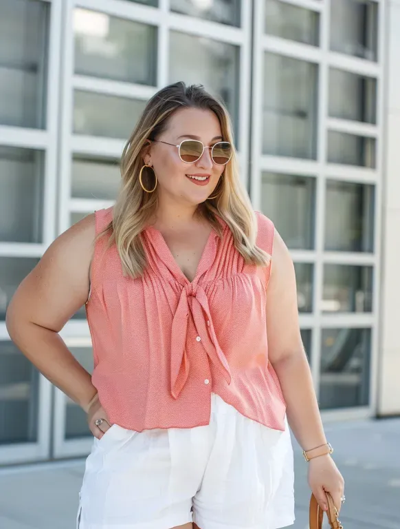 This outfit combines comfort and style effortlessly. The top features a playful tie-front design with soft pleats, perfect for those hot summer days. Paired with flowy white shorts, the ensemble provides just the right amount of coverage while keeping things breezy and light. The subtle coral color of the top pops beautifully against the simplicity of the white shorts. Accessories like gold hoop earrings and sunglasses finish off the look, giving it a chic, casual vibe that s perfect for a sunny afternoon out.