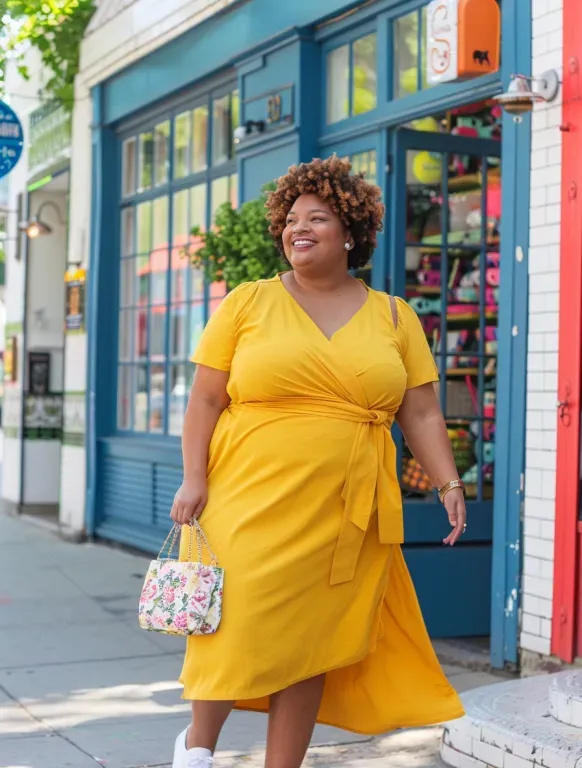 I can’t get over how fresh and cheerful this dress feels! The yellow is such a confidence booster, and the wrap design is so flattering on all body types. I love how the tie waist allows for a custom fit and creates that perfect hourglass shape. Pairing it with white sneakers keeps the look playful and comfy, making it both stylish and practical. This dress is definitely one of those pieces that brightens up your day and your wardrobe!