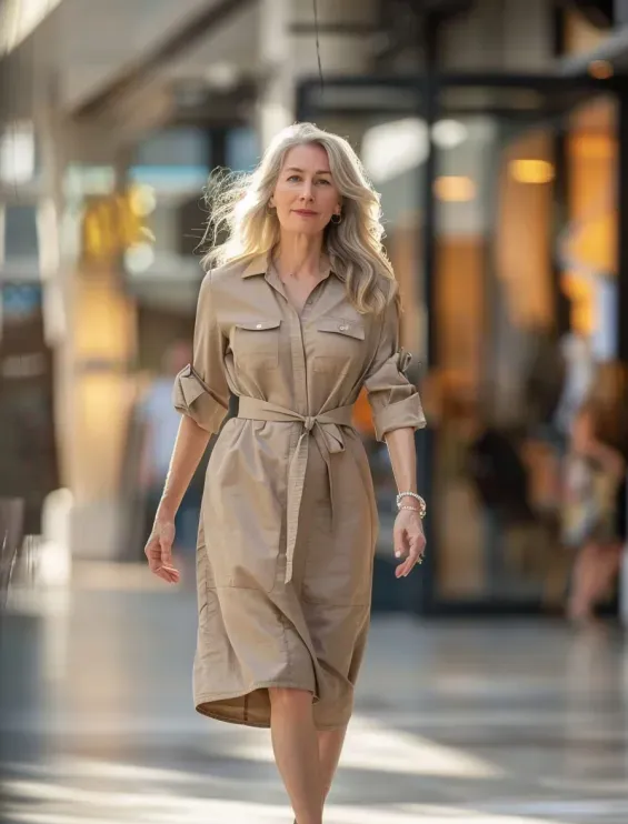 This khaki-toned shirt dress takes the classic utility look and makes it feel totally refined. With its structured collar, chest pockets, and roll-up sleeves, it feels practical but still sleek. The tie waist gives it shape without being too fussy, and the mid-length hem keeps it balanced and wearable. Styled with strappy sandals and a simple bracelet, it s modern, versatile, and totally cool.