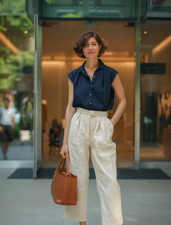 This look is effortlessly polished with just the right hint of French-girl charm. The navy button-up blouse is crisp but still breathable, tucked into high-waisted cream trousers that are structured but not stiff. Add in tan wedge sandals, a sleek leather tote, and delicate jewelry, and you ve got a go-to outfit that works just as well for city strolls as it does for casual lunches.