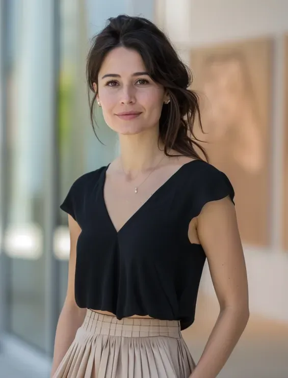 This outfit is the perfect blend of grace and modern minimalism. The soft black blouse with fluttery sleeves feels feminine and flowy, while the high-waisted pleated beige skirt brings structure and movement. It s a pairing that s dressy without feeling stiff, and that dainty necklace is just the right finishing touch.