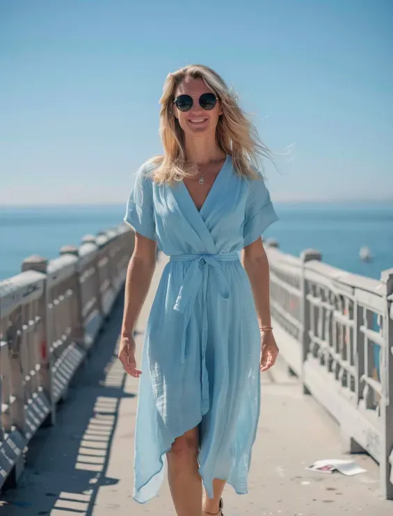 This airy light blue wrap dress is summer simplicity at its best. The soft fabric flows gently in the breeze, and the wrap design cinches at the waist for that easy, flattering silhouette. It s got a subtle high-low hemline that adds just a touch of drama without being too much. The whole look is tied together with dainty jewelry and comfy sandals for a perfect walk-by-the-sea vibe.