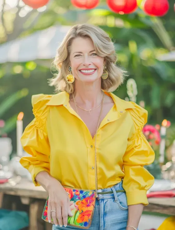 This bold yellow blouse is pure sunshine with a stylish twist. The puffed sleeves, structured collar, and tucked-in look bring just the right amount of drama. Paired with high-rise light-wash jeans and playful accessories like colorful earrings and a floral clutch, this outfit is giving festive and fun without going overboard.