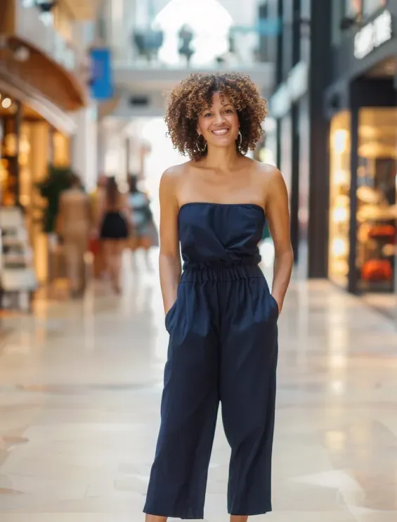 This strapless navy jumpsuit brings a whole new level of cool to the summer scene. It s got that easy, slip-on-and-go vibe but still manages to look totally put together. The cinched waist keeps things flattering, and the wide cropped legs make it comfy and stylish all at once. Finished off with strappy nude sandals and hoop earrings, this look is perfect for everything from brunch to boutique browsing.