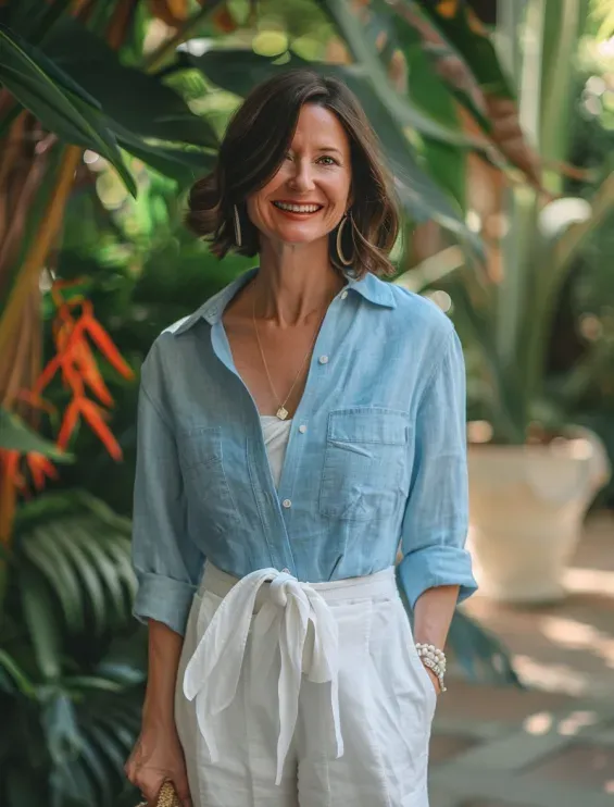 This outfit is summer tailoring done right. The lightweight chambray-style shirt is casually tucked into high-waisted white linen trousers, tied at the waist with a breezy bow. Rolled-up sleeves and a relaxed fit make it feel lived-in, while the structured shape keeps it classy. Accessorized with a woven straw bag, chunky hoops, and layered jewelry, it’s the kind of look that turns heads without shouting.