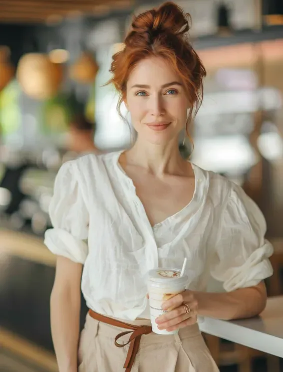 This outfit is the kind of chic that looks effortless but feels super pulled together. The airy, slightly crinkled white blouse has those puff sleeves that make everything feel a little extra, and it s tucked into high-waisted beige paperbag trousers cinched with a slim brown belt. Add a messy bun and an iced latte in hand and you’ve got modern muse energy on a Monday.