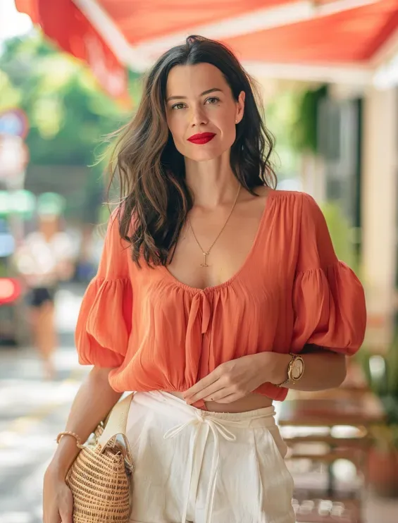 This outfit is playful and polished at the same time. The flowy orange blouse with voluminous sleeves brings all the summer drama, while the high-waisted cream shorts keep things cool and breezy. Add a straw bag and red lipstick and you’ve got a look that s made for sipping sangria on a sunny patio.