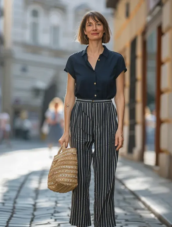 This outfit pairs a navy short-sleeve blouse with high-waisted, vertically striped trousers for a fresh and tailored summer vibe. The cropped pants and rolled sleeves keep the look light and breathable, while a structured straw bag and embellished sandals bring in that effortless, sun-kissed charm.