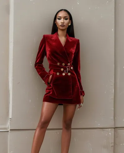 This crimson velvet blazer dress redefines power dressing with a glamorous twist. The tailored double-breasted design is elevated by luxurious gold buttons and a matching belt that cinches the waist to perfection. The plush velvet fabric adds richness and texture, while the mini length keeps the look daring and bold. Paired with black ankle-strap heels, this outfit is striking, sophisticated, and utterly unforgettable.