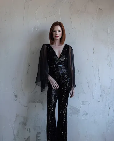 This dazzling black jumpsuit is a show-stopper for any Valentine’s dinner. The deep V-neckline adds a touch of allure, while the glittering fabric catches the light beautifully for an ultra-glam vibe. Flowing sheer sleeves bring a dramatic yet ethereal element, and the flared pant legs create an elongating silhouette. Paired with metallic heels, this look is pure sophistication with a hint of drama.