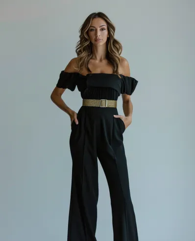 Off-Shoulder Black Jumpsuit with Golden Glam