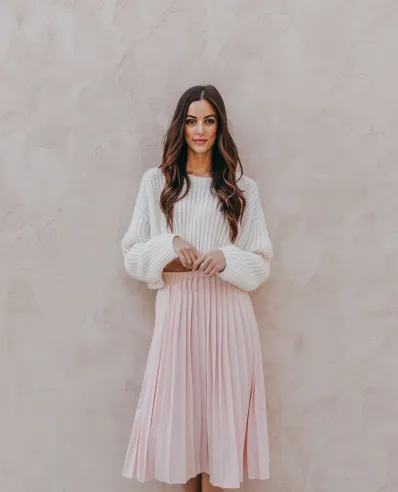 This soft and romantic look is perfect for a cozy yet elegant Valentine s dinner. The chunky white knit sweater adds warmth and a touch of casual charm, while the pale pink pleated midi skirt brings an air of femininity and grace. The flowing pleats add movement to the outfit, and paired with nude heels, it strikes the perfect balance between comfort and sophistication.