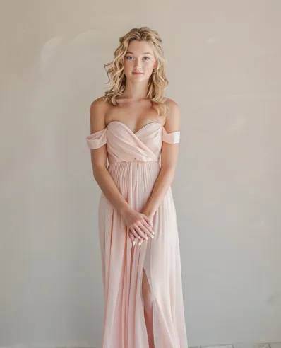 This dreamy blush-pink gown is pure romance in fabric form. The off-shoulder sweetheart neckline gracefully highlights the collarbones, while the delicate pleated bodice adds structure and sophistication. Its flowing, floor-length skirt features a subtle slit that s perfect for a hint of allure, and the soft chiffon material moves beautifully with every step. Paired with minimal accessories and dainty heels, this dress is all about effortless charm.