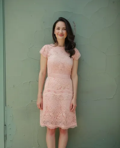 This soft blush lace dress is the epitome of romance and femininity. Featuring a high neckline and cap sleeves, it offers a classic silhouette that feels effortlessly elegant. The intricate lace detailing adds texture and depth, while the knee-length hemline keeps it sweet and sophisticated. Styled with nude heels, this outfit is perfect for a romantic Valentine s dinner that calls for understated grace.