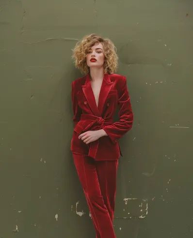 This deep red velvet suit is the ultimate blend of bold and chic. The tailored blazer features a waist-cinching tie that enhances your silhouette, while the matching straight-leg trousers offer a sleek and sophisticated finish. The plush velvet fabric adds richness and luxury, making it perfect for a Valentine s dinner where you want to stand out. Paired with gold heels and a pop of red lipstick, this look is a true showstopper.