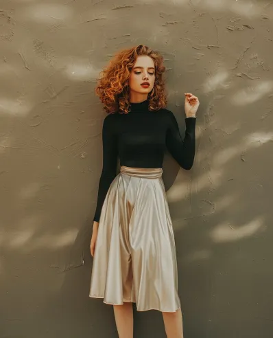 This black and satin pairing is effortlessly chic with a touch of vintage charm. The fitted black turtleneck top creates a sleek and polished silhouette, perfectly balancing the voluminous champagne satin midi skirt. The soft sheen of the skirt adds an element of luxury, while black ankle boots ground the look, giving it a modern and slightly edgy vibe. It s the ideal choice for a Valentine s dinner that feels elevated yet relaxed.