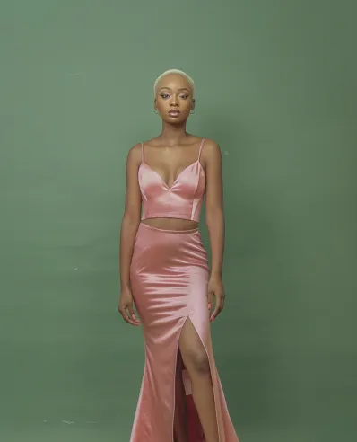 This stunning two-piece gown in a soft rose hue is the perfect blend of elegance and modern flair. The fitted satin crop top with spaghetti straps offers a sleek, contemporary vibe, while the matching high-waisted skirt features a dramatic thigh-high slit and an elegant train that cascades behind you. Paired with strappy gold heels, this look is all about turning heads at your Valentine s dinner.