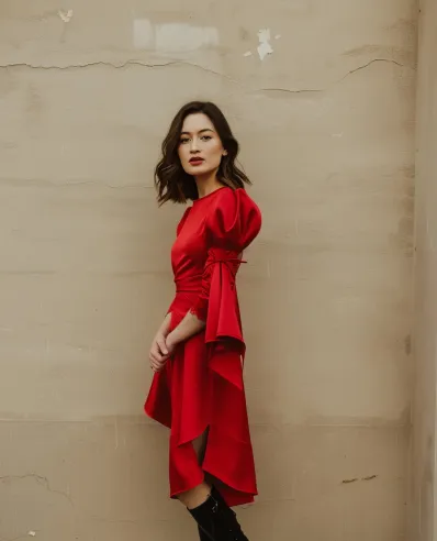 This bold red dress is all about making an entrance. The ruched bodice hugs the waist beautifully, creating a flattering hourglass silhouette, while the asymmetrical hemline adds a playful, flowy touch. The standout feature, though, is the voluminous puff sleeves and dramatic flared cuffs that give this dress a couture-like edge. Paired with sleek black knee-high boots, this look is striking, modern, and full of attitude.