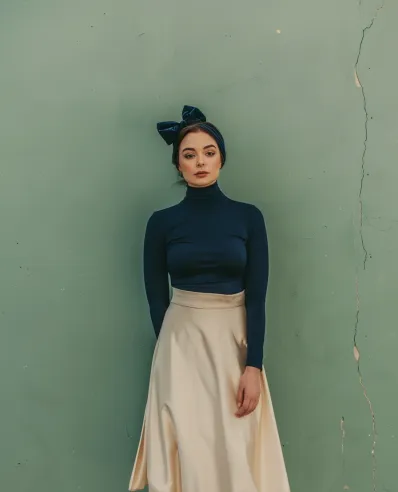 This outfit is the epitome of timeless elegance. A cream turtleneck pairs effortlessly with a flowing navy satin midi skirt, creating a look that s both refined and understated. The high-waisted skirt adds an air of sophistication, while sleek black boots keep the outfit grounded and winter-appropriate. The soft, neutral tones balance perfectly with the rich navy, making this ensemble a tea party classic.