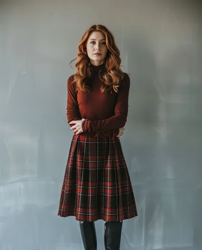 This outfit is a winter classic with a warm, rust-colored turtleneck paired beautifully with a traditional red and black plaid skirt. The A-line silhouette of the skirt adds a vintage touch, while sleek black knee-high boots anchor the look with sophistication. The earthy tones and structured pieces make this ensemble perfect for a chilly winter tea party.