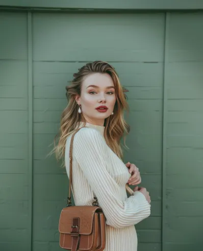 This cream ribbed-knit midi dress is the definition of understated sophistication. The high neckline and long sleeves add an elegant touch, while the soft, figure-skimming fabric keeps it cozy and comfortable. Paired with a structured caramel-brown crossbody bag, the look is both chic and practical. Minimalist earrings and subtle makeup complete the ensemble, allowing the warm neutrals to shine.
