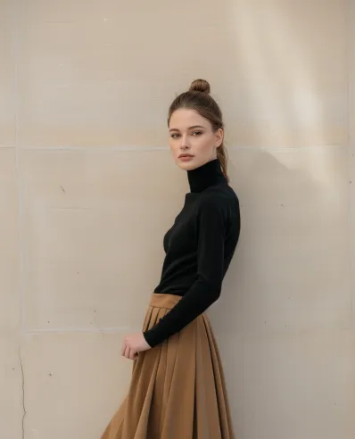 What makes this outfit so special is its versatility and timeless appeal. The black and camel combo is such a classic pairing it s like the fashion equivalent of a warm cup of Earl Grey. The pleated skirt adds a touch of femininity, and the turtleneck keeps it sleek and cozy. Honestly, I d wear this when I want to look sophisticated without overthinking it. It s that outfit that makes you feel classy the second you put it on!