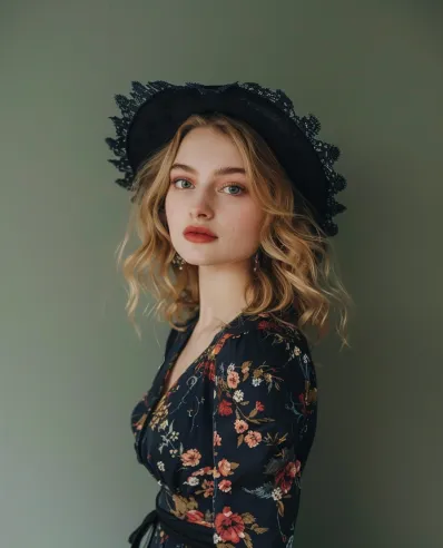 This navy floral wrap dress brings a romantic, vintage-inspired vibe that s perfect for a winter tea party. The delicate floral print adds warmth and charm, while the black lace-trimmed hat takes the outfit to a whole new level of elegance. The cinched waist creates a flattering silhouette, making this look effortlessly feminine and timeless.