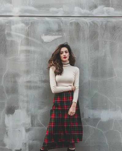 I love how this outfit combines warmth and elegance so effortlessly. The plaid skirt gives such a vintage, holiday-ready charm, while the turtleneck keeps it modern and flattering. Honestly, I d wear this to feel festive but also a little fancy and those boots? They re a statement on their own. You ll look like the queen of the tea party without even trying too hard!