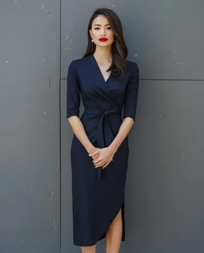 What I adore about this look is how effortlessly chic it feels. The wrap design is universally flattering, and the deep navy tone is such a classy alternative to black. The silver heels bring just the right amount of sparkle, and the whole outfit feels polished yet approachable. I d wear this when I want to feel confident and elegant without a hint of fuss ideal for sipping tea in style while owning the room!