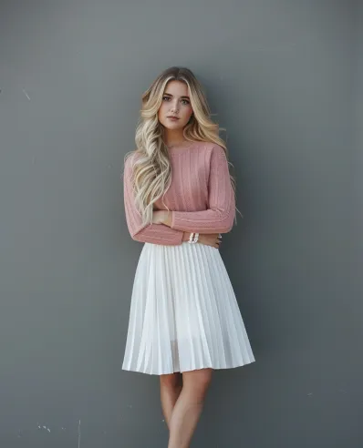 This outfit is the perfect mix of soft and stylish. A delicate blush pink knit sweater pairs beautifully with a crisp white pleated skirt, creating an effortlessly feminine vibe. The lightweight fabric of the skirt adds movement and elegance, while the sweater keeps things cozy. Finished off with white strappy heels, this look strikes the perfect balance between casual and refined.