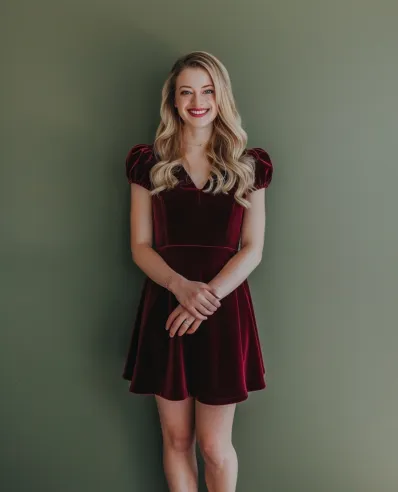 What I adore about this outfit is how effortlessly it mixes sophistication with fun. The velvet fabric feels luxurious and seasonally perfect, while the shorter length keeps it youthful and fresh. And let s not forget the puffed sleeves they add just the right amount of charm! I d wear this to stand out in the best way, with a look that says, I m here to sip tea and steal the spotlight.â It’s cheerful, classy, and completely unforgettable!