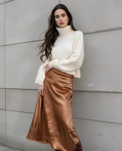 This outfit blends cozy and chic like a dream. A creamy oversized turtleneck sweater adds a touch of warmth, perfectly paired with a lustrous copper satin midi skirt that brings all the shine. The look is completed with sleek brown leather boots, which add a rustic flair while keeping things practical for the season. The mix of textures soft knit and glossy satin is absolutely stunning.