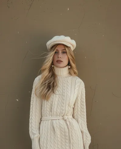 This cream cable-knit sweater dress is the perfect winter staple, combining warmth and style effortlessly. The turtleneck and belted waist add structure to the cozy texture, creating a flattering and feminine silhouette. Paired with a matching cream beret and subtle gold accessories, this look is sophisticated yet approachable, perfect for a winter tea party.