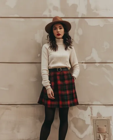 This outfit brings a playful yet polished vibe with its cream ribbed sweater tucked into a red and green plaid mini skirt. The high-waisted design is accented with a classic black belt, creating a flattering silhouette. Black tights and ankle boots keep it seasonally appropriate, while the wide-brimmed brown hat adds a rustic flair that s both stylish and unique.