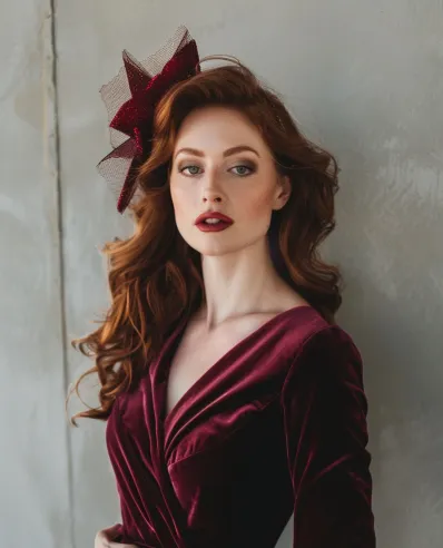 This deep crimson velvet dress is pure sophistication, with its wrap design and luxurious texture that hugs the figure in all the right places. The three-quarter sleeves and subtle draping elevate its timeless appeal. What takes this look to the next level is the stunning fascinator a bold statement piece with netting and structured detail that adds a dash of vintage charm. It s the perfect outfit for a winter tea party with an elegant twist.