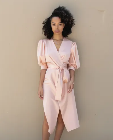 This blush pink wrap dress is a vision of feminine charm. The puffed sleeves add a trendy, playful touch, while the wrap-around waist tie accentuates the silhouette beautifully. With its elegant midi length and asymmetrical hem, this dress strikes the perfect balance between polished and fun. Paired with metallic pink heels, it s the ultimate choice for a stylish winter tea party.