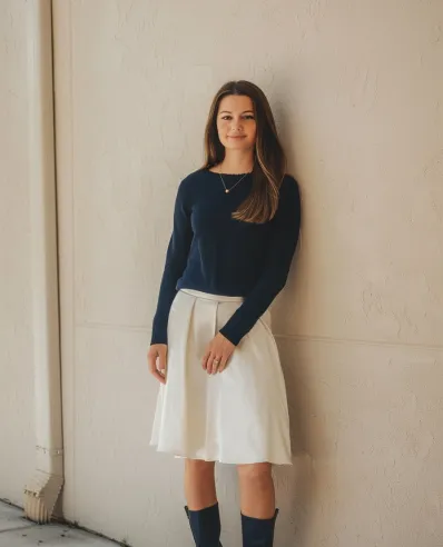 This outfit pairs a fitted navy sweater with a flowy cream A-line skirt, creating a classic and elegant look. The structured boots in matching navy tie the outfit together seamlessly, adding a touch of modern edge to the overall softness of the ensemble. A simple gold necklace adds just the right amount of sparkle, perfect for a chic winter tea party vibe.