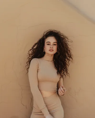 This knitted two-piece set in a warm beige tone is the perfect blend of cozy and daring. The long-sleeve crop top adds a modern twist, while the fitted mini skirt keeps things sleek and stylish. Paired with matching over-the-knee boots, this outfit creates a monochromatic look that feels effortlessly put-together and totally on-trend.
