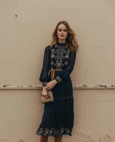 This embroidered navy midi dress is a showstopper with its intricate gold detailing and high-neck Victorian-inspired silhouette. The flowy fabric and tiered skirt add a whimsical touch, while the mustard yellow belt provides a subtle pop of color. Paired with suede tan boots and a textured clutch, this outfit feels timeless and effortlessly chic perfect for a cozy winter tea party.