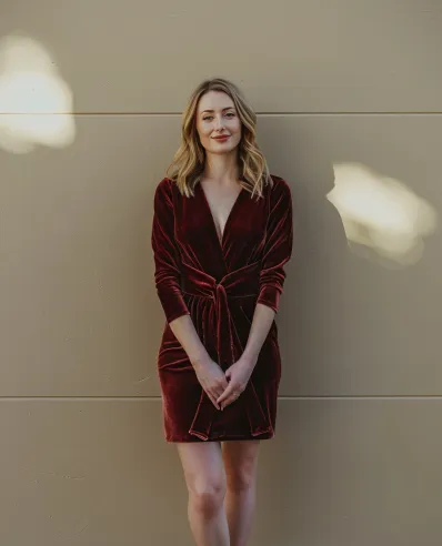 I can t get over how effortlessly elegant this outfit is! Velvet always feels like a hug in dress form, and that rich burgundy color is just so festive and flattering on everyone. The wrap detail adds a touch of drama without going over the top. If I wore this, I d feel like the most put-together guest in the room glamorous, confident, and just a little bit fabulous.